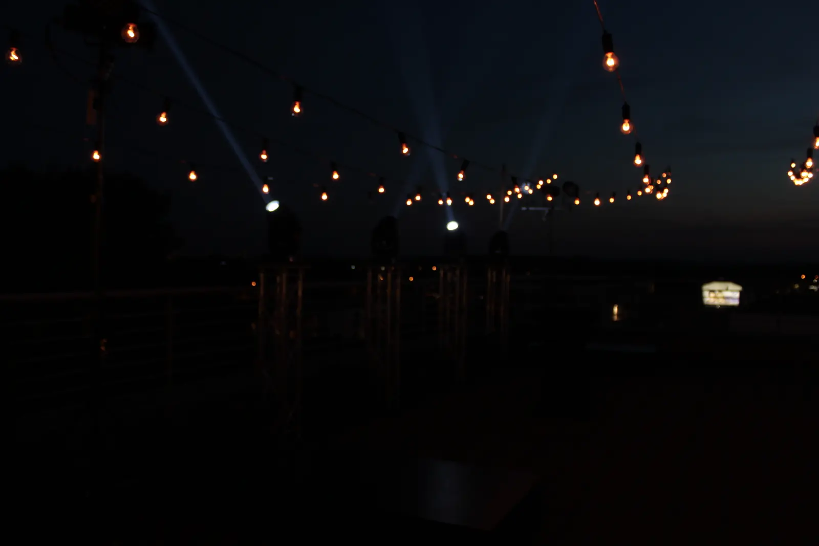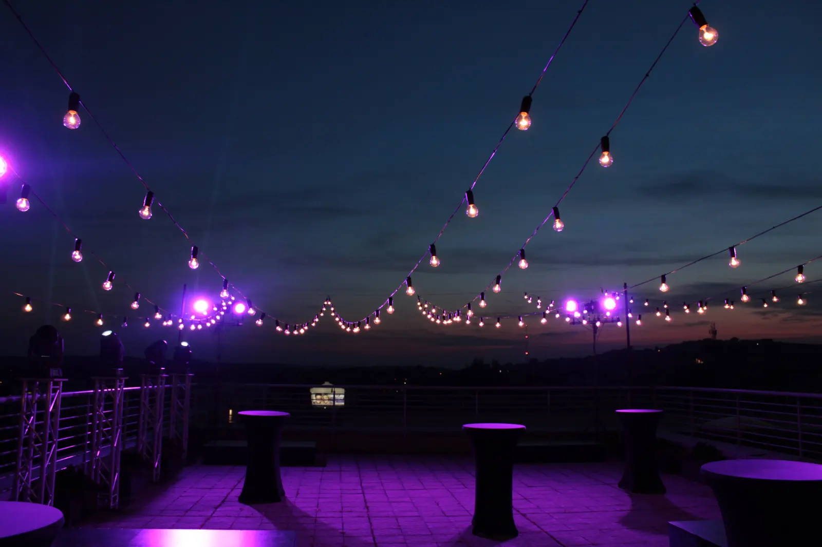 Instalacja obejmowała głównie taras, gdzie girlandy zostały zawieszone nad przestrzenią dla gości, tworząc równomierne i czytelne oświetlenie wieczorne.