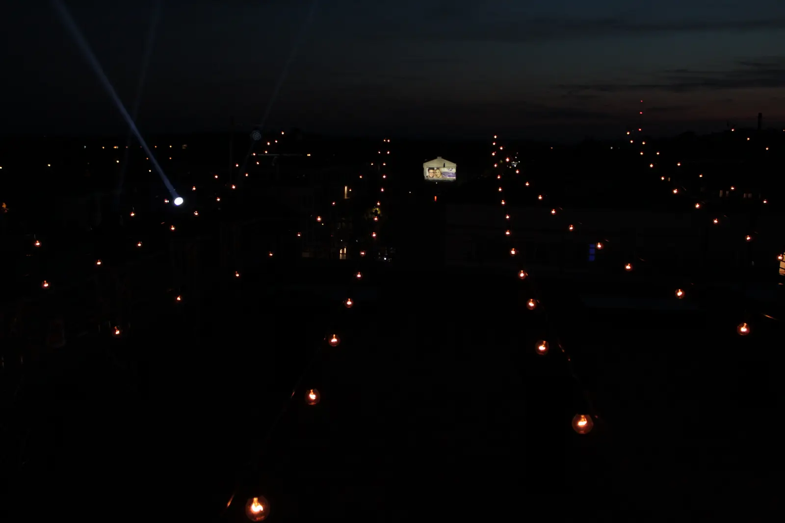 Girlandy zostały zawieszone nad otwartą przestrzenią, co wymagało dostosowania układu do warunków terenowych oraz zapewnienia stabilnych punktów montażowych.