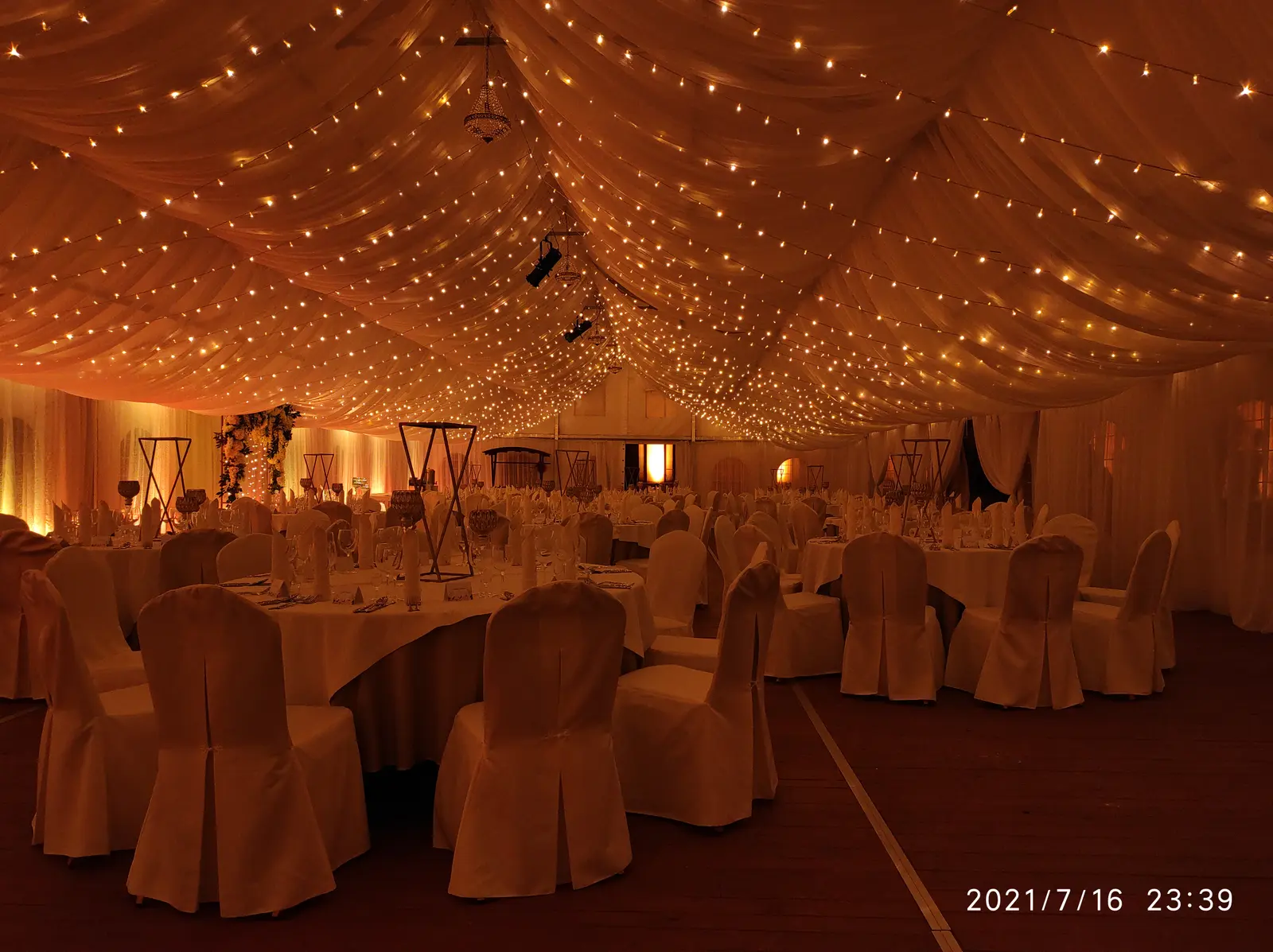 Kolejna realizacja miała miejsce w Oazie Leńcze, gdzie montaż girland został wykonany w przestrzeni plenerowej przed salą weselną.