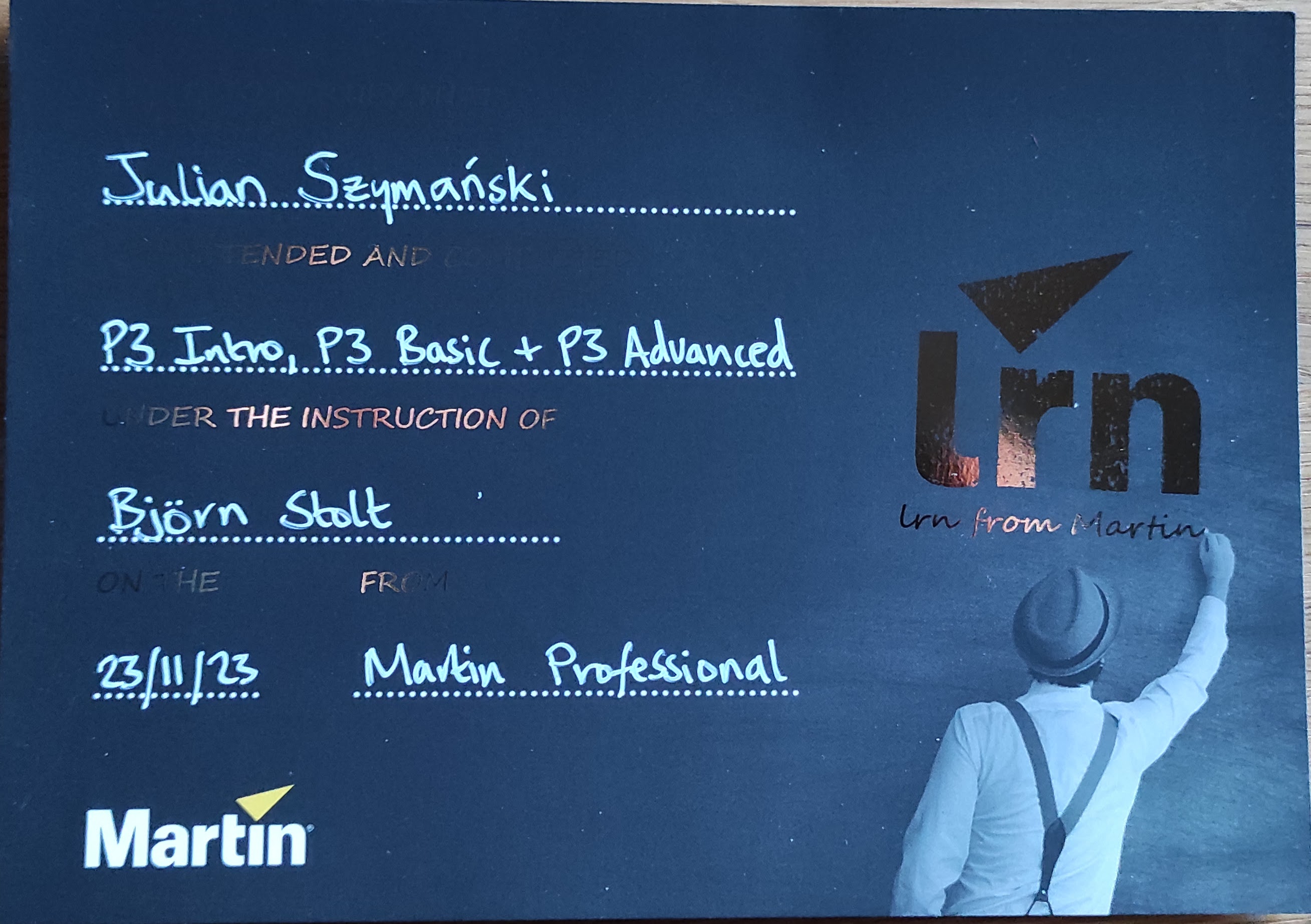 Na szkolenie zostałem zaproszony przez polskiego dystrybutora marki Martin – Stage Source. Program obejmował m.in. prezentację urządzeń, ich praktyczne zastosowania oraz porównania nowych produktów z konkurencyjnymi rozwiązaniami.